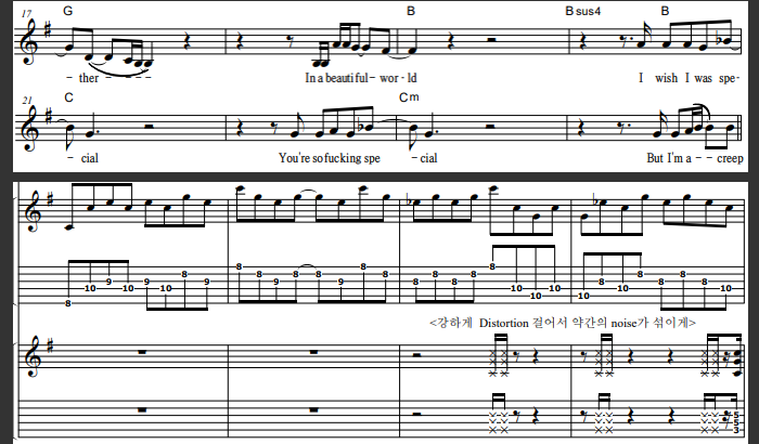 ‘Radiohead-Creep’의 도입부와 분위기가 바뀌는 부분의 기타 연결구